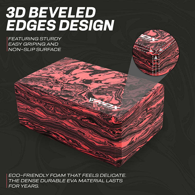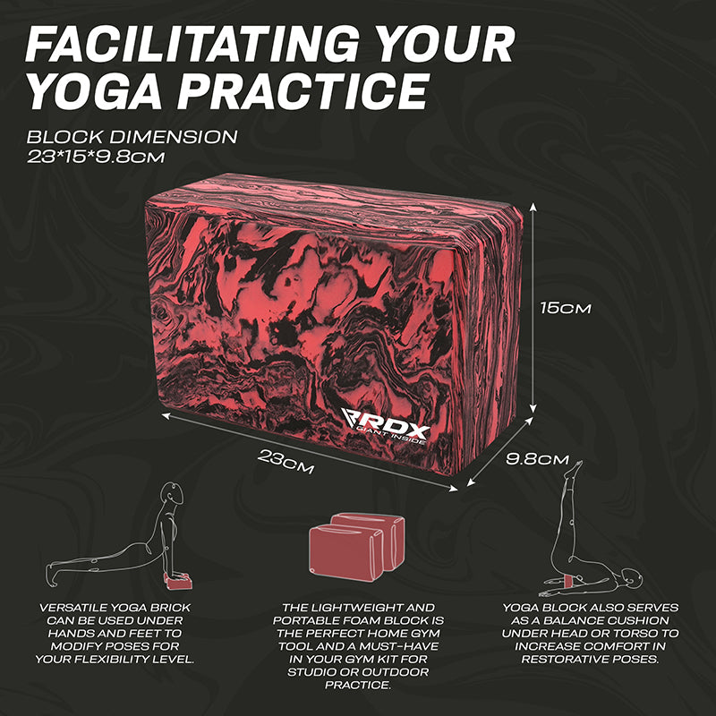Add this optimally sized yoga block (23*15*9.8cm) to your home gym essential and yoga accessories for increased versatility in your practice. Made for beginner and intermediate yogis alike, this sturdy foam yoga block provides strong support for your bridge poses, and comfortable lift to perfect your alignment in the crescent moon stance. Add this optimally sized yoga block (23*15*9.8cm) to your home gym essential and yoga accessories for increased versatility in your practice. Cultivate healthy energy flow by bringing balance and alignment in your form and everyday life with the RDX EVA Foam Red/Black yoga blocks.Sturdy, high-density foam yoga block delivers exceptional strength to help prolong your poses and holds its position even under considerable weight. Eva foam material offers a non-abrasive surface that increases comfort while you flex and stretch out during practice, or ease-into restorative poses. Use the yoga brick under your hands and feet to deepen stretches, improve flexibility and modify poses to match your difficulty level. It also serves as meditation cushion under your head and torso to relax and ensure proper alignment. The soft block is gentler on the joints and muscles during arm balances and backbends, which reduces the strain on muscles and the chances of injury. Non-slip textured surface offers superior traction for the stability and balance needed in your practice to maintain control of movement and improve alignment. Slightly bevelled edges provide a firm and easy-grip surface so you can confidently conquer even the more advanced yoga poses. Get additional help by looking up poses from the included exercise manual. Lightweight and compact design facilitates block-assisted yoga practice anywhere whether it's in your room or under the shade of a giant oak tree. It also retains shape after all sorts of compressions for long-lasting durability.Choose the double colour yoga brick that matches your style to energize your routine and turn functional yoga into art.