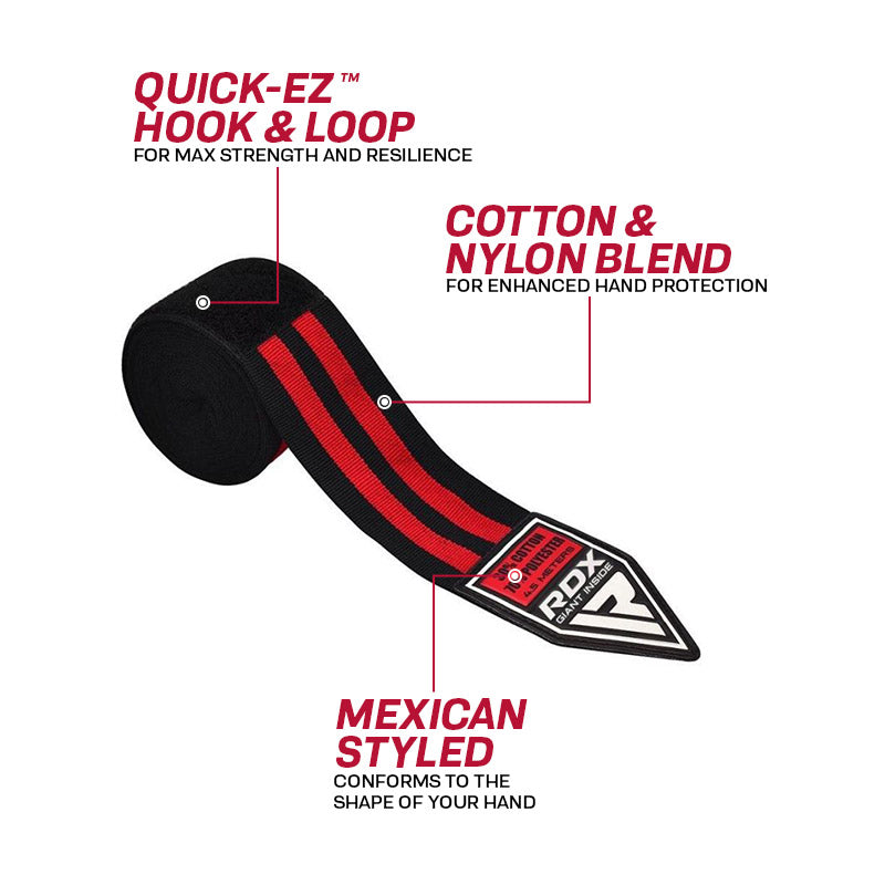 These Mexican styled hand wraps are all the rage in the combat world today. Wrap up the bread and butter when it comes to MMA, Boxing or Muay Thai and get to training without worrying about wrist, knuckle or fist injury. Rolls away for easy application and storage, comes in 4.5 metres length and is thicker than usual for sweat-absorption and added punch safety.