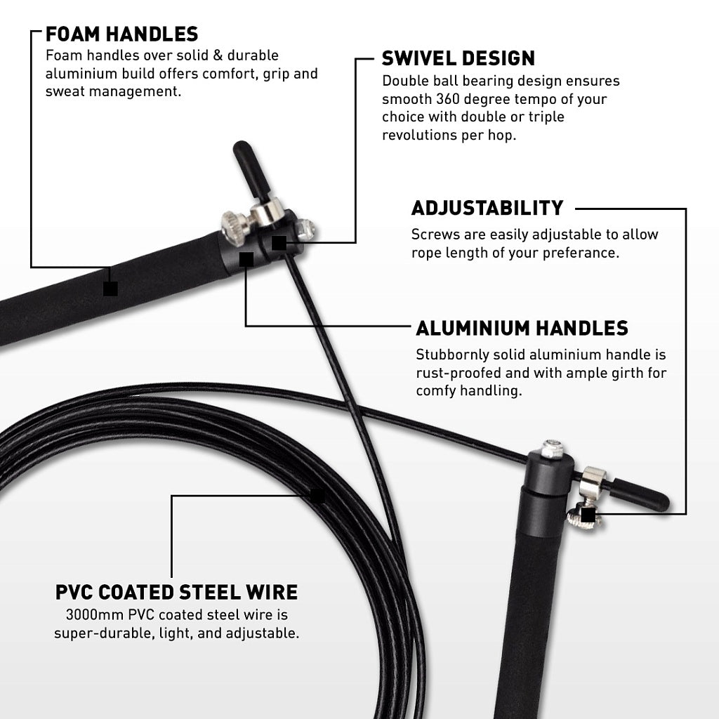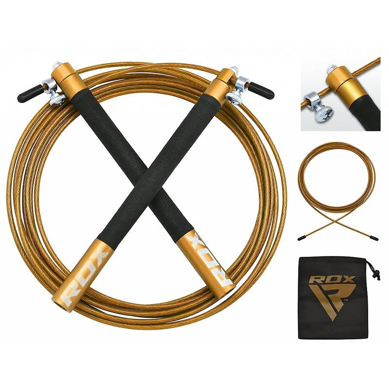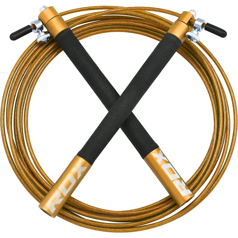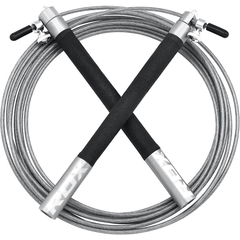 The RDX Adjustable Jumping Skipping Rope is the ultimate piece of equipment for those who incorporate skipping into their training regime. Featuring a number of clever technologies, including our patent pending swivel mechanism, this speed rope rotates swiftly and smoothly to allow rapid jumping no matter how quick you are. A weighted aluminum handle is light and maneuverable, while the special rubberized grip means you won't lose form even when things get sweaty. This speed rope is perfect for building your fitness, improving your coordination, and increasing the speed at which you move - ideal in combat sports.