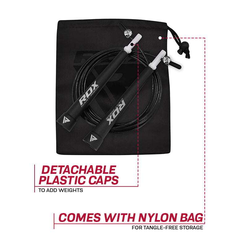 Aspire to fitness today with this 2.4mm thick, PVC-coated steel wire skipping rope with modifiable length that extends to 10ft. 12cm in length, handles feature mini ball bearings in the metal top for unimpeded mobility so you can skip with more revolutions in a single hop. Detachable caps at the handle base lets you add weights to your training routine. The rope comes with a nylon bag for efficient storage purposes that'll keep the rope tangle-free.
