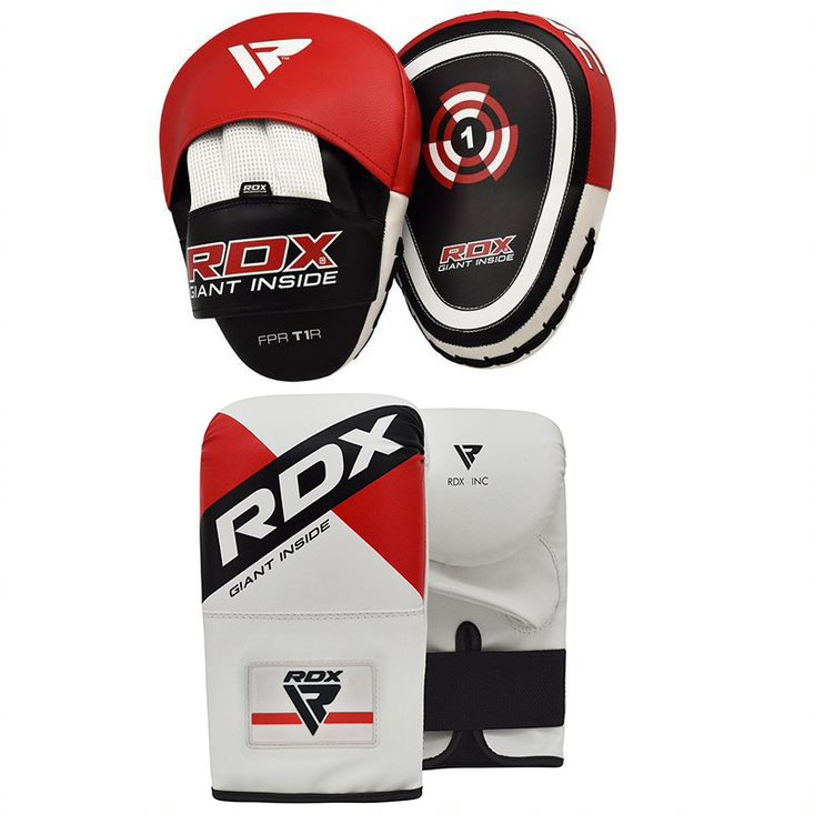 Boxing pads and gloves set, designed for boxing training, MMA training, Muay Thai and other contact sports where focus pads are essential for strike practice. Made from a solid Maya Hide leather that won't crack under pressure, enhanced with two layers of foam padding to dissipate shock, featuring perforated holes for max ventilation to prevent sweat build-up plus a mega grip to keep you stable and balanced, these boxing mitts are the ultimate must-have for pros in the making. Hone and sharpen your accuracy and speed with unbeatable protection. Hook-and-Loop strap offers the perfect, snug fit.