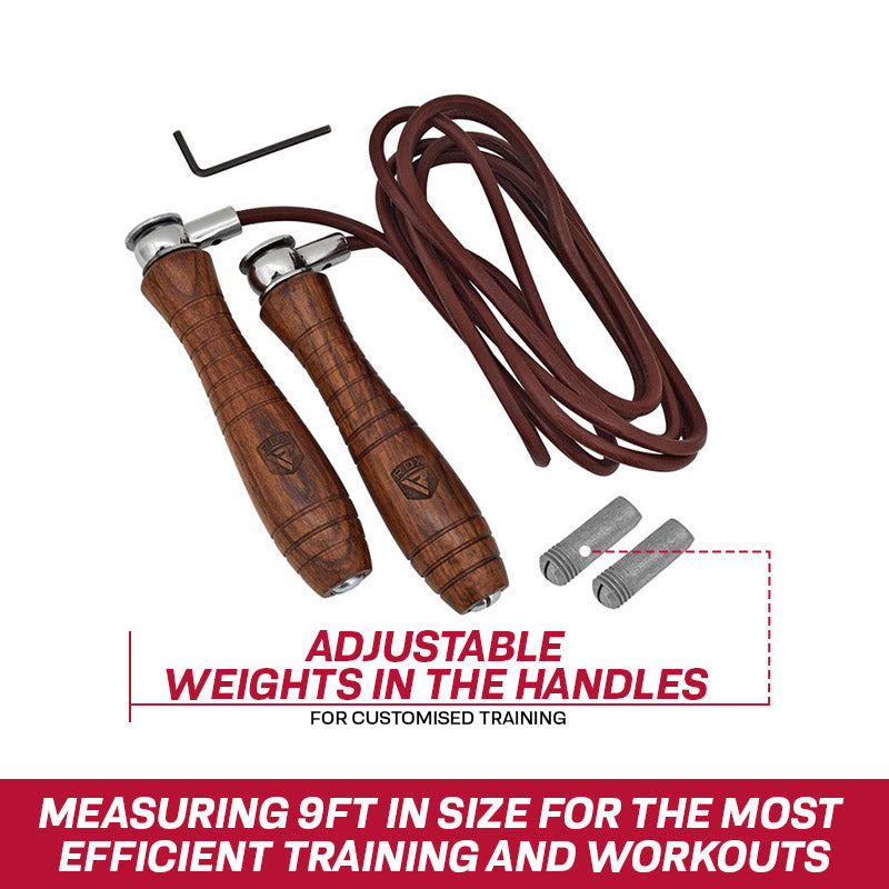 Raise your fitness game with our weighted 9ft skipping rope. Designed for boxing training, speed training and more. Changeable weights in the handles means that you can create a customised workout and made from super tough cowhide leather, this rope is built to withstand every kind of punishment. Additionally, the 90 degree perpendicular swivel ensures anti-traction skipping plus the wood designed handles offer a superior grip for the most effective training sessions.
