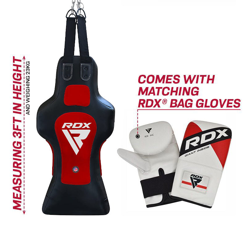A hanging torso punch bag, designed to enhance your training routine and hone your combat skills for boxing, MMA or other contact sports. Shaped like a dummy, fighters can practice sparring or improve clinch, knees and body kicks. This is a hybrid body punch bag that comes complete with matching gloves and features a waterproof outer, a tear resistant lining, and a secure nylon built strap for an unbreakable hold no matter what you throw at it. Anatomically engineered and the perfect size for coaching and flawless in-ring technique.