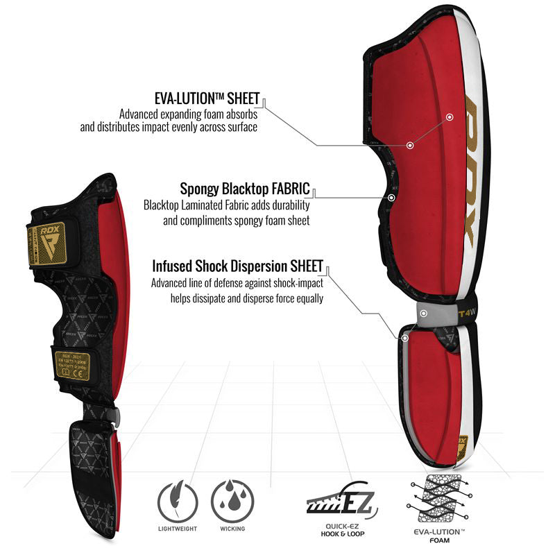 RDX® produces fight gear that is suited for champions. Original cowhide leather coats the exterior of these finely designed Shin Guards for improved durability and endurance. Tri-Slab Shell-Shock gel integrated padding absorbs high-intensity strikes like a sponge and dissipates force equally throughout the area. Featuring an exclusive P-fit system to ensure perfect and snug fit, and comes with a double-strap Quick-EZ hook & loop closure to hold guards in place with zero slip. WAKO approved and CE certified by SATRA TECHNOLOGY.