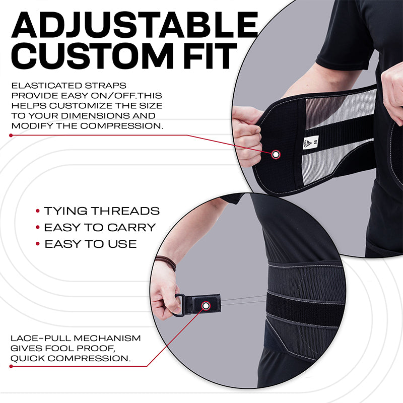 Working towards your mobility, endurance, and strength training goals from the convenience of your home gym couldn't get any easier with RDX's Lace-up waist support. Lumbar back support belt improves functionality, stabilization & comfort with optimum fitting.Made with a combination of fast-drying polyester, durable nylon and breathable cotton fabrics, this lumbar padded brace maximizes sports performance, corrects posture and helps you stay active. Powerful back protection waist belt immobilizes the spine in a neutral position, shifting pressure off spinal column while still permitting requisite body movement. Equipped with a solid and sturdy ABS support plate that lasts a long time during lifting activities, grueling gym trainings and home gym workouts. Recommended by orthopedic doctors for providing therapeutic relief for the lumbar spine, as well as elevating pain from strains, sprains and muscle spasms. Also helps with the treatment, management and prevention of various back conditions including spinal stenosis, herniated discs and osteoarthritis. Advanced back support brace works with a lace pull mechanism and durable plastic parts that provide independent pressure on the lower back especially the lumbar vertebrae. Adjustable Hook and Loop straps help you achieve high compression and ensure a customizable fit according to your support needs. The no tying, no-thread pulling closure system facilitates easy application and adjustment. Great for old age users, since the lumbar support back belt requires less force to secure in place and change degree of compression while wearing. Professional back support belt with strong adhesive Hook and Loop' straps provides budge-proof wear and feels non-abrasive on the skin. It is ideal for daily wear can be easily concealed under clothes without seeming obvious or damaging the fabrics. Black, lower back support brace is available in S-XL sizes and suitable for both men and women.