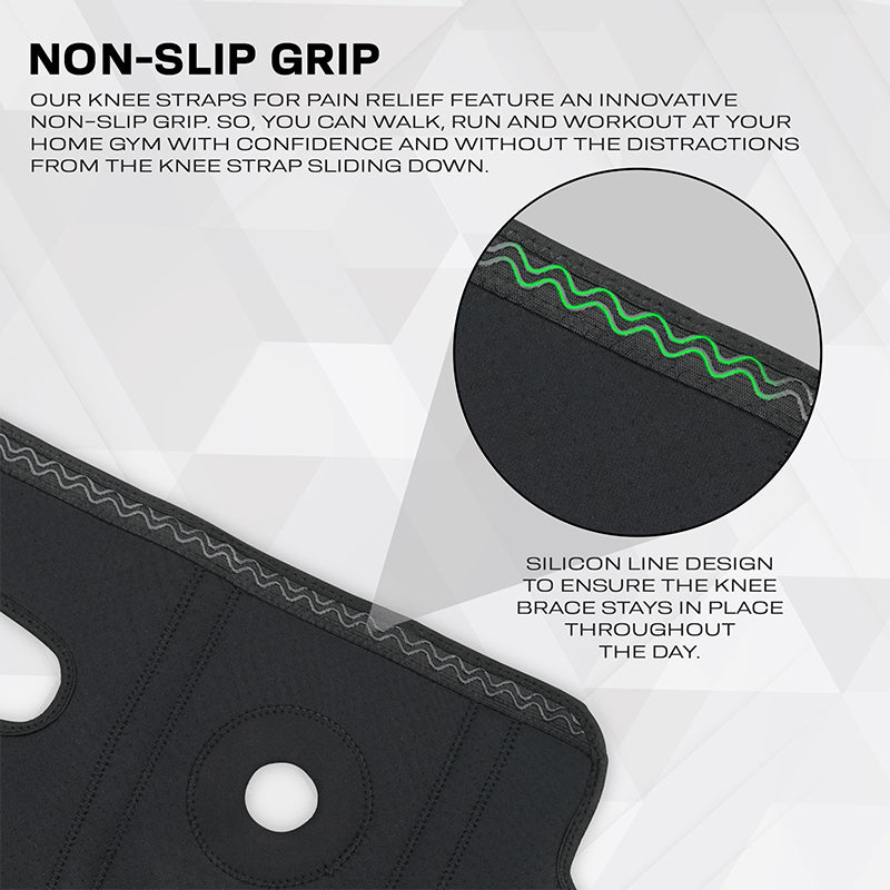 Premium polyester and nylon used in our knee brace helps avoid skin abrasions and insulates the knee to promote blood circulation for fast recovery. Tiny perforations in the fabric also promote ventilation to prevent bad odour and buildup of excessive sweat. Lightweight, durable construction facilitates long-lasting use for everyday activities and allows conveniently wear it underneath your clothes. Unique silicone anti-slip design prevents the knee support from sliding down during intense exercises.