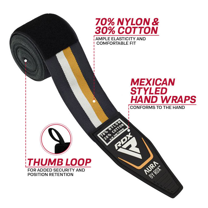 How every Aura needs a vessel, every weapon needs a sheathe. Nothing is more symbolic of combat sports than hand wraps. The Aura Mexican styled boxing hand wraps are made using 70% nylon and 30% cotton to offer just enough slack per thread to snuggly wrap and compress the hands tiny bones into a rock-hard fist. The wraps easily conform to your hands intricate movements without cutting blood supply or restricting mobility in anyway. The result is two boulders ready to be thrown without fear of injury. Protect your weapons - sheathe them well.