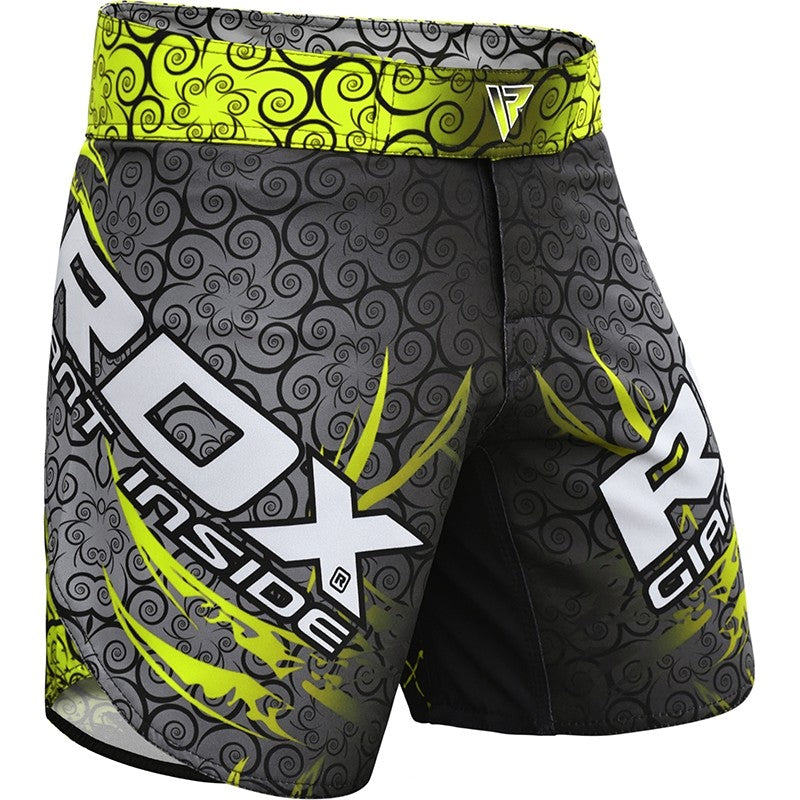 RDX Sports brings you a brand new line of patent pending MMA training shorts that'll maximize your output in the gym whether its Brazilian Jiu-Jitsu, Muay Thai, boxing, kickboxing or MMA. Vibrant and contemporary, the design holds more than aesthetics at its core. Performance Polyester enhances your training experience tenfold by wicking sweat away from the body and into its outer layer. T-3 stitching, a level of elasticity and a spandex groin translates to only one thing stubborn durability, body conformation and moisture ventilation for a comfy workout session.