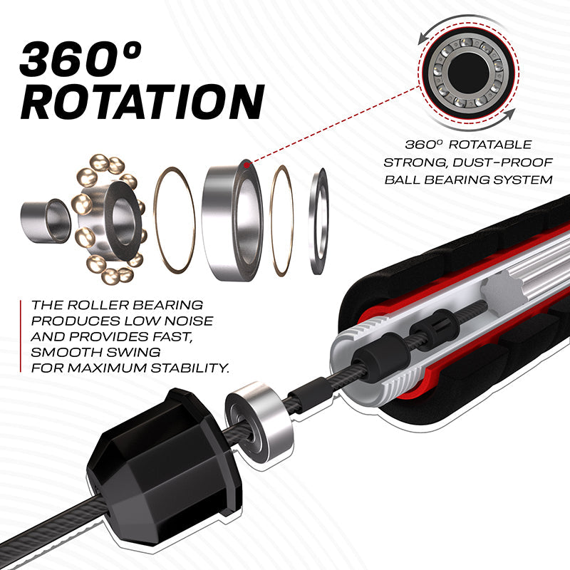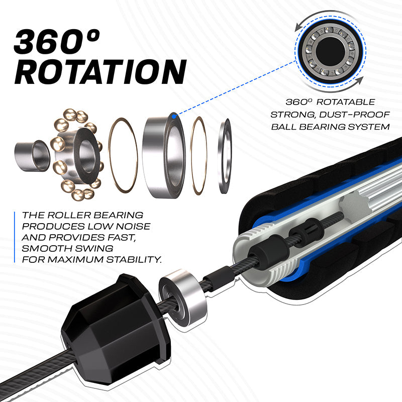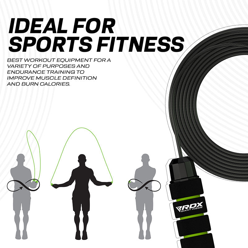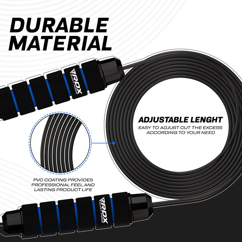 The RDX W1 jump rope with foam handles should be the centerpiece of your cardio workouts. Whether you're in the gym or at home, the W1 Jump Rope will have your heart rate racing with every skip. The durable PVC coated cable wire can sustain rough outdoor use against concrete pavements or collision against indoor wooden floors without damaging the internal steel cable. Equipped with non-slip, soft memory foam handles, the rope fits comfortably in your hands for a pain-free skipping rope experience. Special grip-enhancing silicon handlebar rings prevent slippage and ensure a firm grip even in sweaty hands. The adjustable 10.3 ft length cable allows users of different sizes to modify the rope according to their height. Comes with its own antimicrobial pouch and comprehensive workout guide to ensure you train properly even when you're away from the gym. Choose from red, blue and green color options to make your workouts even more vibrant.DURABLE MATERIAL- High-strength steel wire with a scratch-resistant PVC coating provides a professional feel and lasting product life. It prevents damage to internal cables during collision with abrasive surfaces.