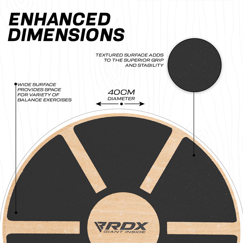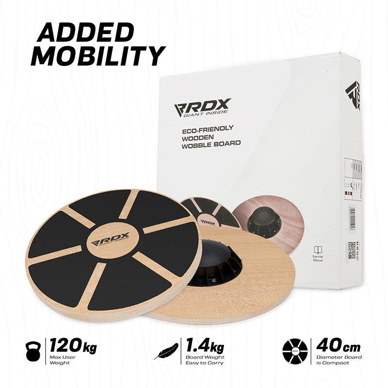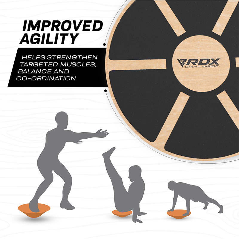 Boost flexibility, agility and take your sports performance to a whole new level with RDX eco-friendly wooden wobble board. This non-slip wobble board improves core strength, enhances posture and assists in rehabilitation. Eco-friendly wood as a core material, the balance board can withstand grueling workouts and the anti-skid surface provides maximum safety and premium grip. Our board offers 360-degree rotation with 15-degree tilting angle. Equipped with extra-wide 40cm diameter and 7.5cm height, making it a complete starter balance board for home gym use. Its 1400gm weight, compact build and portable design allows you to carry it anywhere and never let you skip a workout. Eco board comes with a comprehensive workout guide so you can train properly even when you are away from your home gym. Available in scintillating black, blue and neutral orange colors.