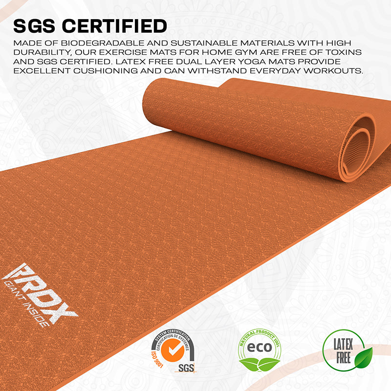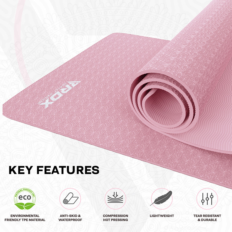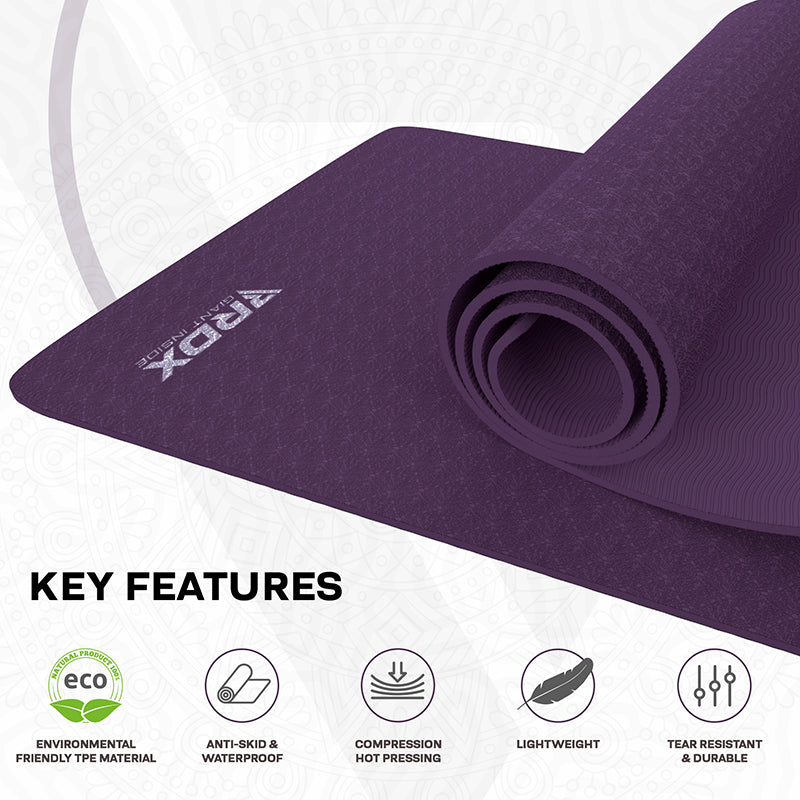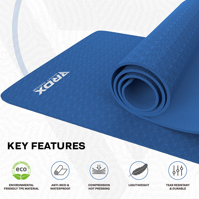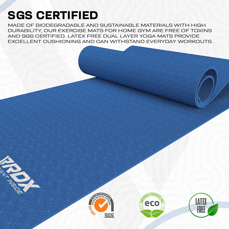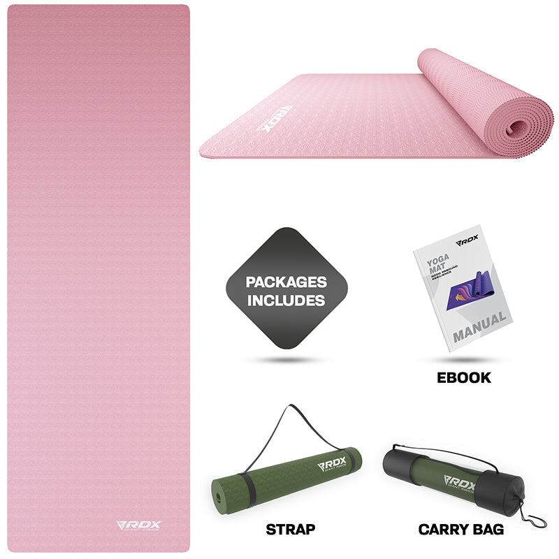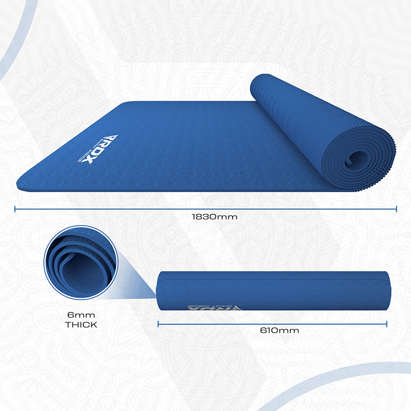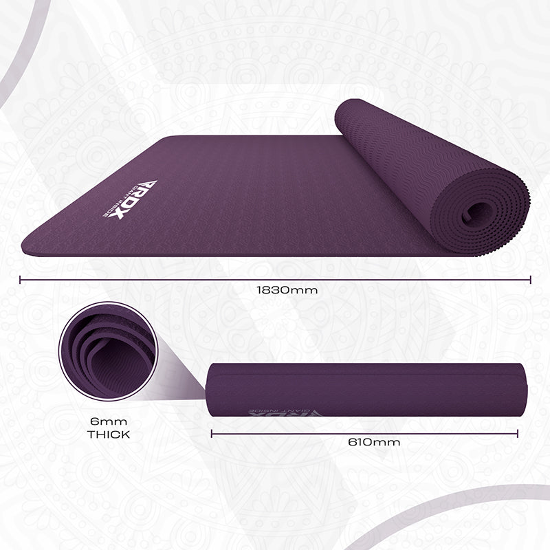 Embark on your yogic journey with gratitude and fulfillment by aligning your energy to discover perfect balance of mind, soul and body. Our extremely soft, non-slip texture, biodegradable TPE yoga mats offer comfort and security at an affordable, budget price. High density, fine-textured foam top surface of 6mm thickness provides higher rebound resilience to these mats to protect joints and facilitate all types of workouts yoga, Pilates, physio or toning exercises. RDX's TPE Yoga Mats are SGS certified and free of toxins.Exercise mats for home gym features double-layered, tear-proof construction in 183x61x0.6cm dimensions ensure the exercise mat is durable and built to accommodate users of all sizes. Our workout mats are made of premium TPE that is non-absorbent, water-resistant, and non-pungent an accumulation of dust and sweat. The anti-skid/anti-slip surface of dual-layer gym mat prevents slippage and offers a firmer grip during intense poses ensuring fluid movement.Choose your yoga mat in an exciting color to match your style. Bio-degradable high resilience yoga mat TPE comes with a carry bag & strap and exercise manual for convenient use. Being lightweight and portable allows you to carry our workout mats anywhere for a quick workout.