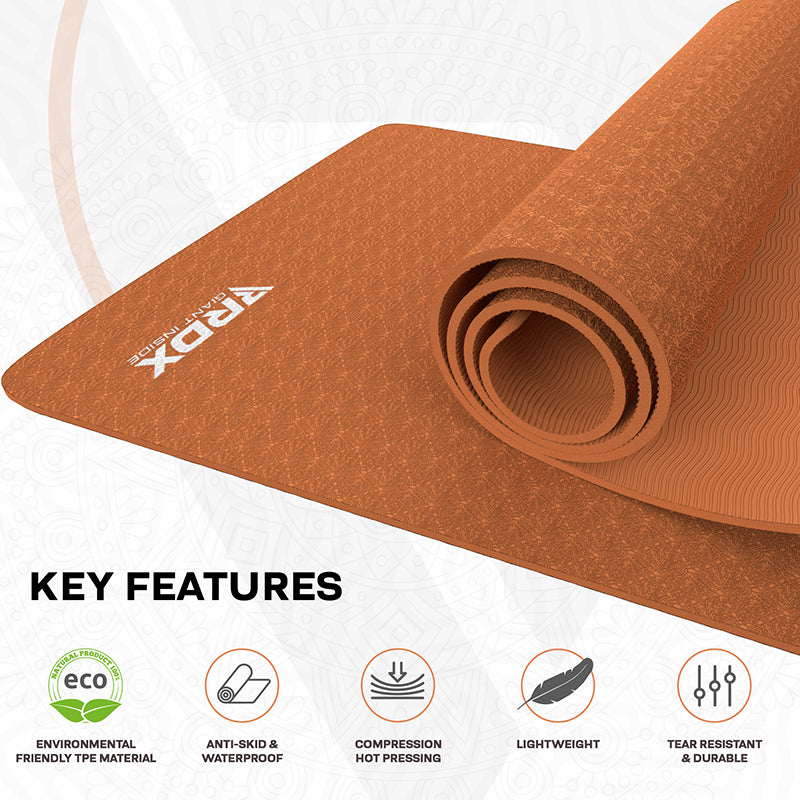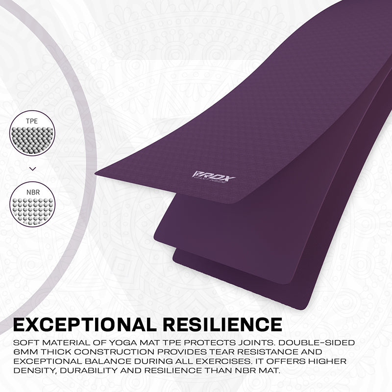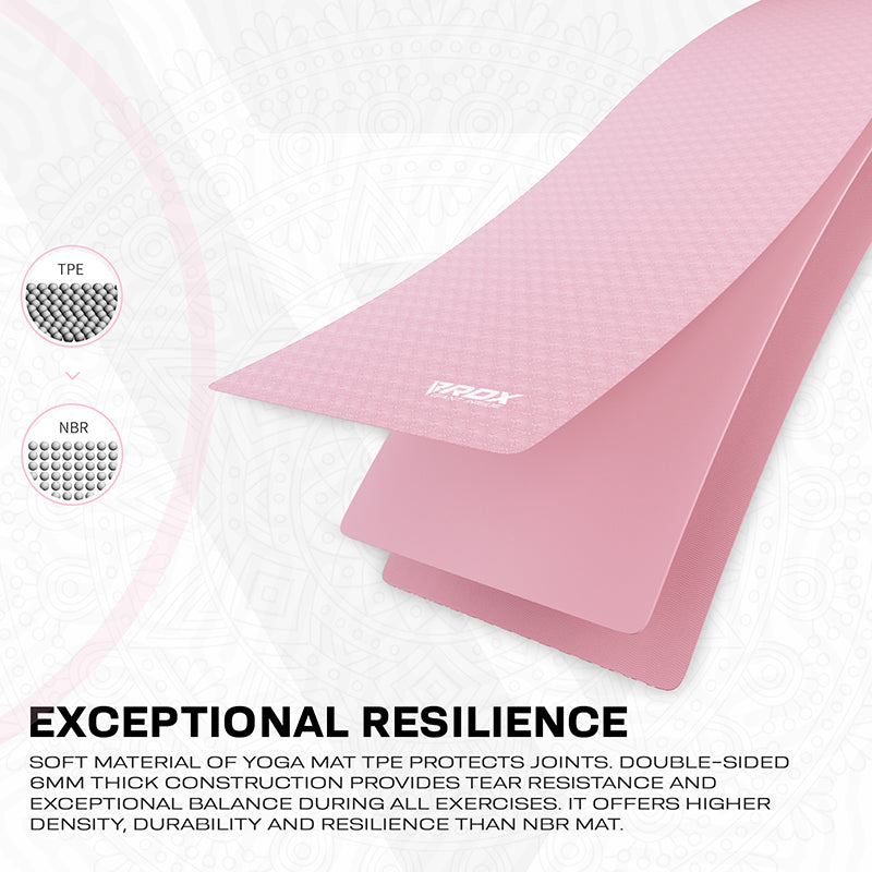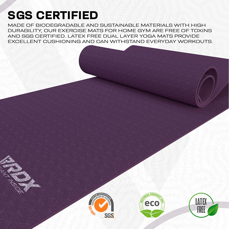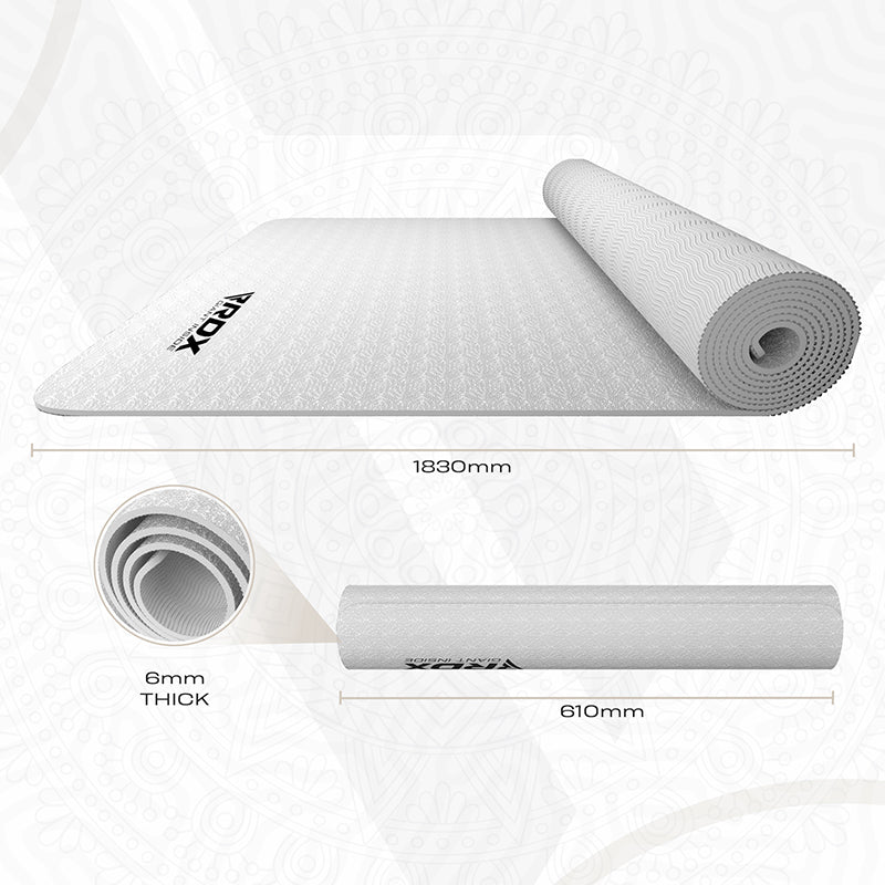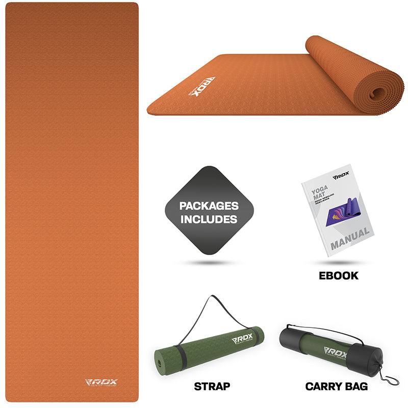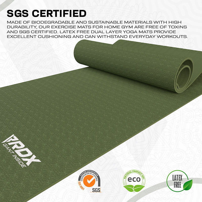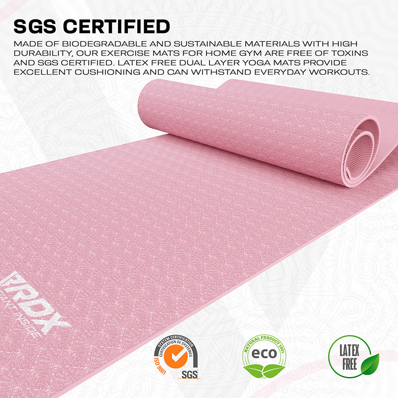 Embark on your yogic journey with gratitude and fulfillment by aligning your energy to discover perfect balance of mind, soul and body. Our extremely soft, non-slip texture, biodegradable TPE yoga mats offer comfort and security at an affordable, budget price. High density, fine-textured foam top surface of 6mm thickness provides higher rebound resilience to these mats to protect joints and facilitate all types of workouts yoga, Pilates, physio or toning exercises. RDX's TPE Yoga Mats are SGS certified and free of toxins.Exercise mats for home gym features double-layered, tear-proof construction in 183x61x0.6cm dimensions ensure the exercise mat is durable and built to accommodate users of all sizes. Our workout mats are made of premium TPE that is non-absorbent, water-resistant, and non-pungent an accumulation of dust and sweat. The anti-skid/anti-slip surface of dual-layer gym mat prevents slippage and offers a firmer grip during intense poses ensuring fluid movement.Choose your yoga mat in an exciting color to match your style. Bio-degradable high resilience yoga mat TPE comes with a carry bag & strap and exercise manual for convenient use. Being lightweight and portable allows you to carry our workout mats anywhere for a quick workout.
