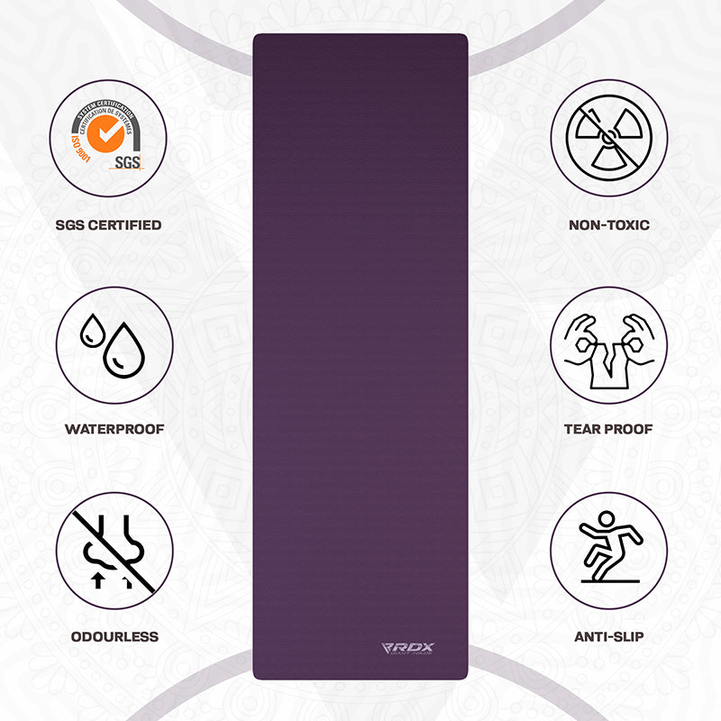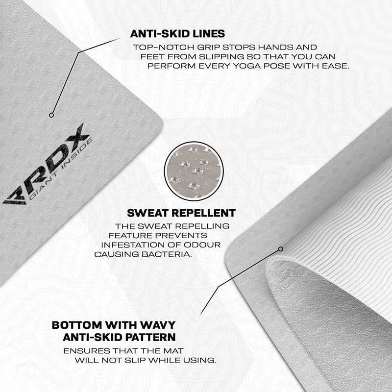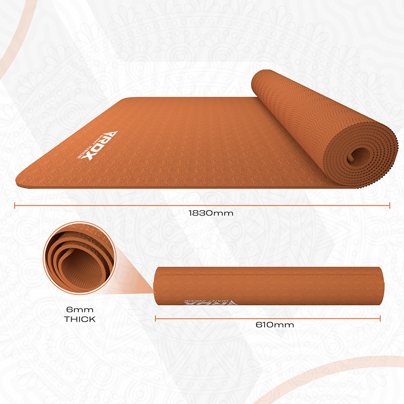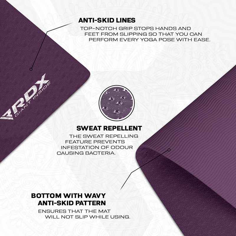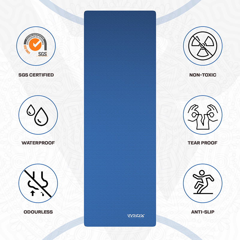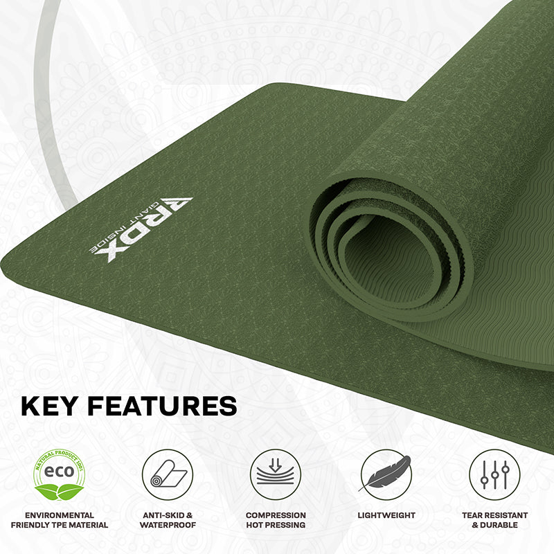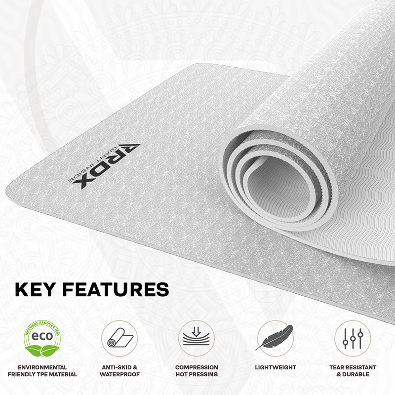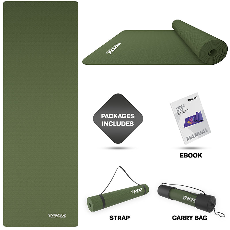 Embark on your yogic journey with gratitude and fulfillment by aligning your energy to discover perfect balance of mind, soul and body. Our extremely soft, non-slip texture, biodegradable TPE yoga mats offer comfort and security at an affordable, budget price. High density, fine-textured foam top surface of 6mm thickness provides higher rebound resilience to these mats to protect joints and facilitate all types of workouts yoga, Pilates, physio or toning exercises. RDX's TPE Yoga Mats are SGS certified and free of toxins.Exercise mats for home gym features double-layered, tear-proof construction in 183x61x0.6cm dimensions ensure the exercise mat is durable and built to accommodate users of all sizes. Our workout mats are made of premium TPE that is non-absorbent, water-resistant, and non-pungent an accumulation of dust and sweat. The anti-skid/anti-slip surface of dual-layer gym mat prevents slippage and offers a firmer grip during intense poses ensuring fluid movement.Choose your yoga mat in an exciting color to match your style. Bio-degradable high resilience yoga mat TPE comes with a carry bag & strap and exercise manual for convenient use. Being lightweight and portable allows you to carry our workout mats anywhere for a quick workout.