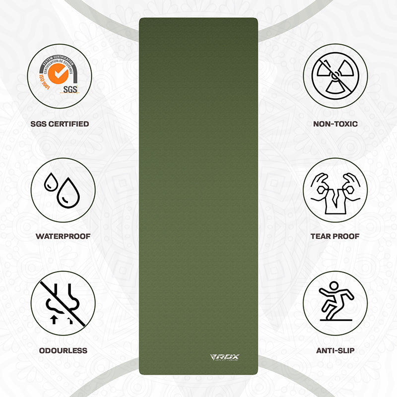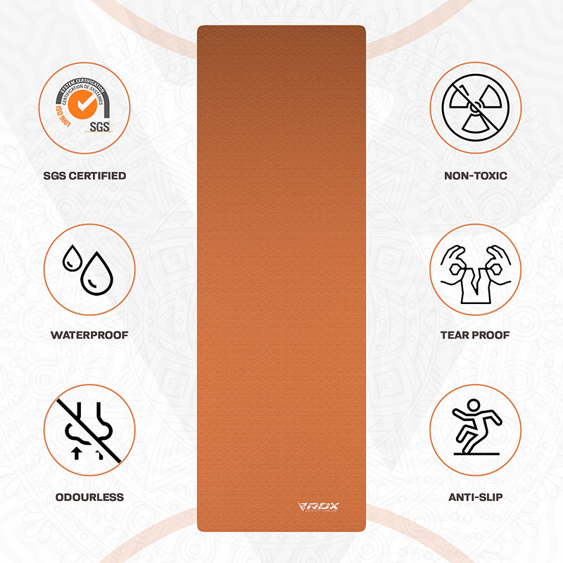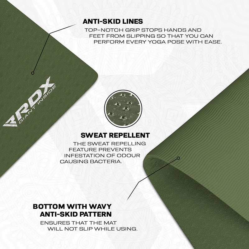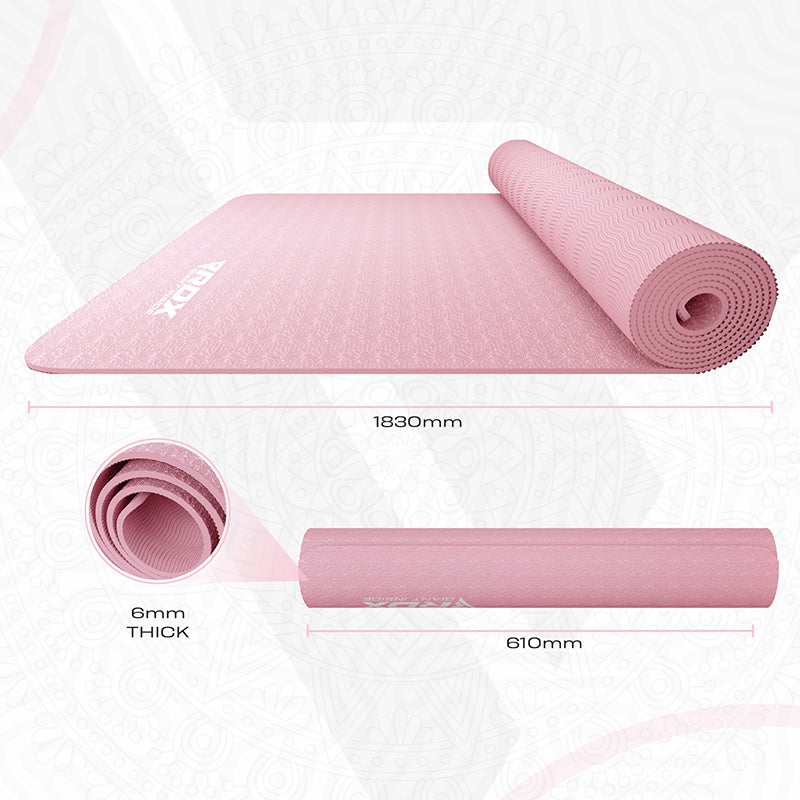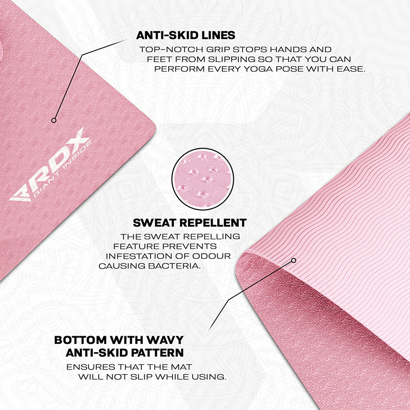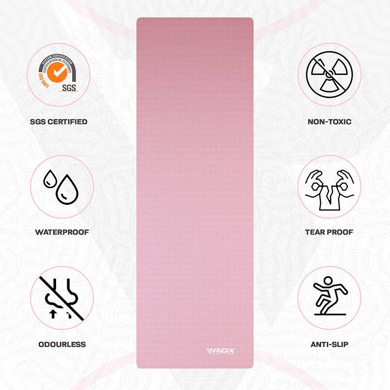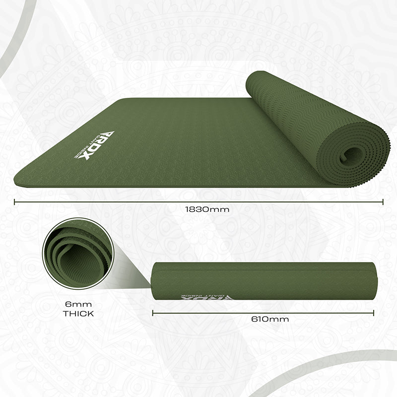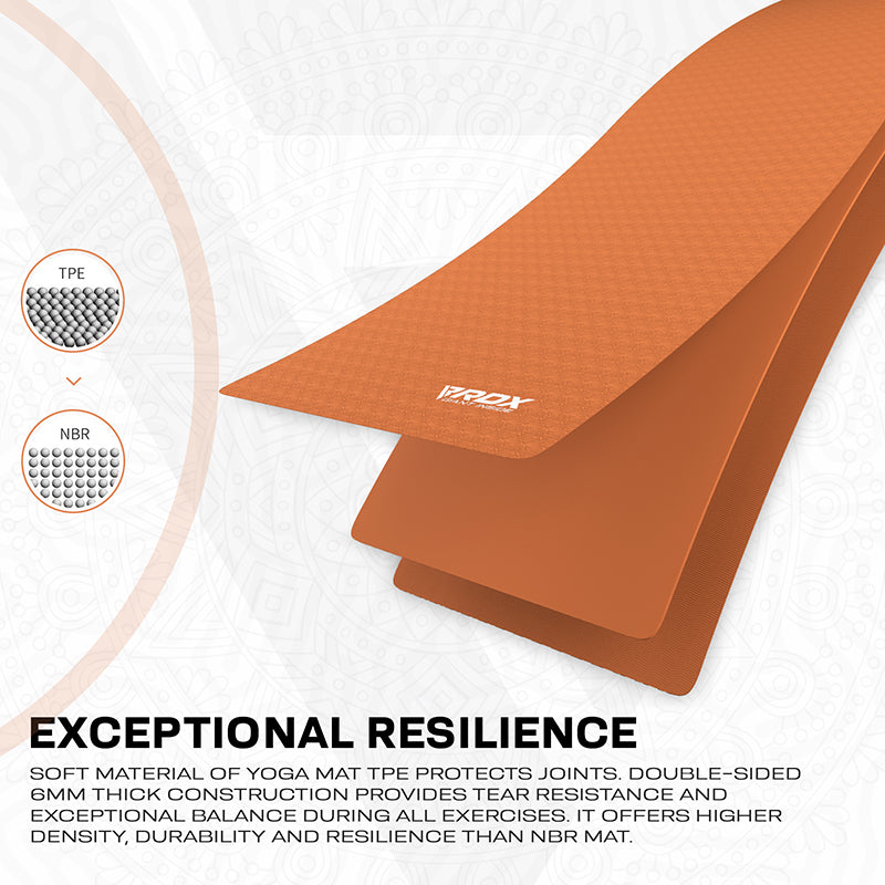 Embark on your yogic journey with gratitude and fulfillment by aligning your energy to discover perfect balance of mind, soul and body. Our extremely soft, non-slip texture, biodegradable TPE yoga mats offer comfort and security at an affordable, budget price. High density, fine-textured foam top surface of 6mm thickness provides higher rebound resilience to these mats to protect joints and facilitate all types of workouts yoga, Pilates, physio or toning exercises. RDX's TPE Yoga Mats are SGS certified and free of toxins.Exercise mats for home gym features double-layered, tear-proof construction in 183x61x0.6cm dimensions ensure the exercise mat is durable and built to accommodate users of all sizes. Our workout mats are made of premium TPE that is non-absorbent, water-resistant, and non-pungent an accumulation of dust and sweat. The anti-skid/anti-slip surface of dual-layer gym mat prevents slippage and offers a firmer grip during intense poses ensuring fluid movement.Choose your yoga mat in an exciting color to match your style. Bio-degradable high resilience yoga mat TPE comes with a carry bag & strap and exercise manual for convenient use. Being lightweight and portable allows you to carry our workout mats anywhere for a quick workout.
