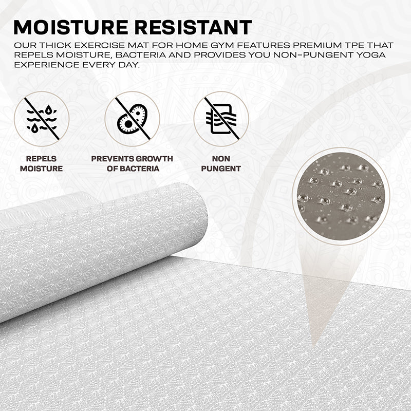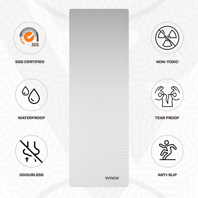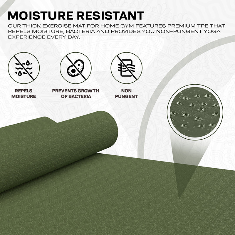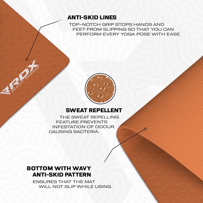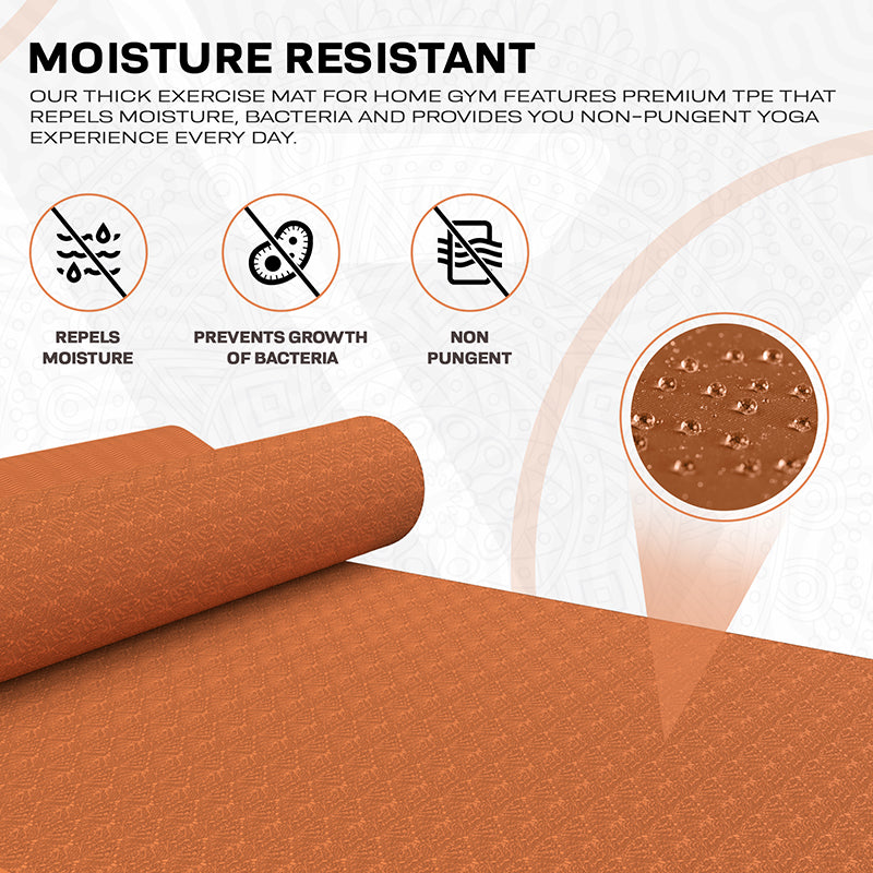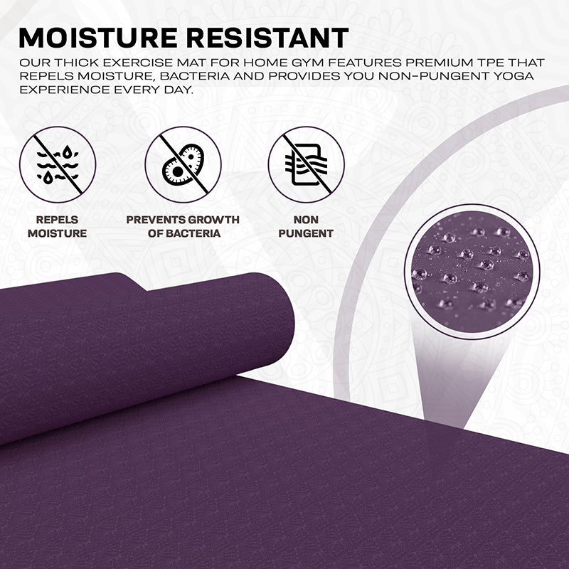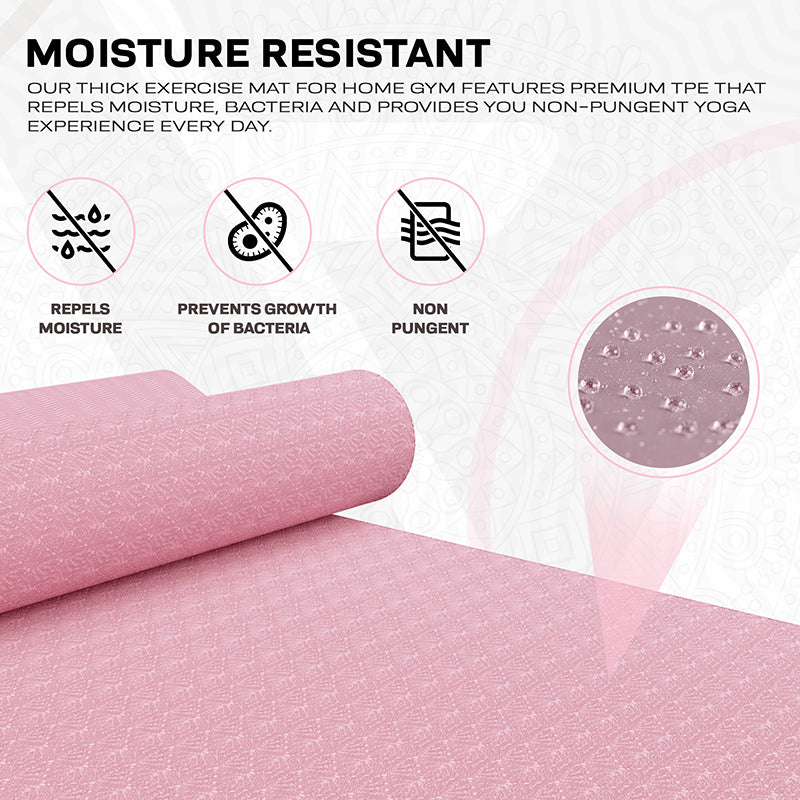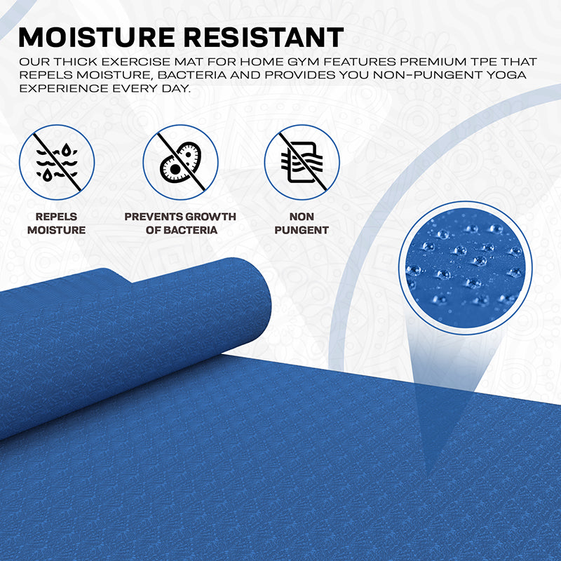 Embark on your yogic journey with gratitude and fulfillment by aligning your energy to discover perfect balance of mind, soul and body. Our extremely soft, non-slip texture, biodegradable TPE yoga mats offer comfort and security at an affordable, budget price. High density, fine-textured foam top surface of 6mm thickness provides higher rebound resilience to these mats to protect joints and facilitate all types of workouts yoga, Pilates, physio or toning exercises. RDX's TPE Yoga Mats are SGS certified and free of toxins.Exercise mats for home gym features double-layered, tear-proof construction in 183x61x0.6cm dimensions ensure the exercise mat is durable and built to accommodate users of all sizes. Our workout mats are made of premium TPE that is non-absorbent, water-resistant, and non-pungent an accumulation of dust and sweat. The anti-skid/anti-slip surface of dual-layer gym mat prevents slippage and offers a firmer grip during intense poses ensuring fluid movement.Choose your yoga mat in an exciting color to match your style. Bio-degradable high resilience yoga mat TPE comes with a carry bag & strap and exercise manual for convenient use. Being lightweight and portable allows you to carry our workout mats anywhere for a quick workout.