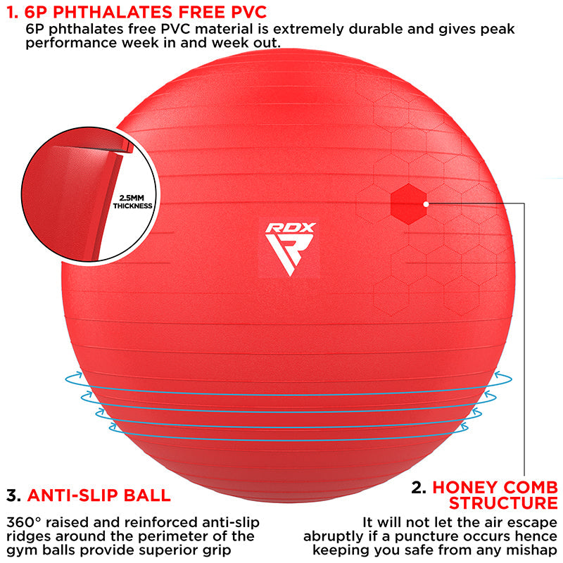 Who says exercise has to be boring? Bring your love for the yoga ball onto the mat to spice up your routine and experience even more benefits of yoga. Superior quality, toxins-free, waterproof, durable and flexible RDX PVC yoga ball is safe for regular use and delivers high compression of up to 250kg. Have fun bouncing around during aerobic exercises on the anti-burst design gym ball, which safely and slowly deflates on being pierced instead of suddenly bursting into shreds. Try exciting yoga poses to work different muscles in a new way. Activate all muscles in your whole body by stretching, balancing, controlling movement and relieving pain or soreness due to inactivity. Relax your back on the stability ball back and unwinds during the boat stance. Work on improving neutral spine posture, strengthening abdominal muscles and the core. A must-have home gym yoga equipment can be also used as office ball chair to get steady waist or as pregnancy ball to help relieve discomfort of pregnant women. Achieve all of that and more with a single, affordable and lightweight yoga and balance training equipment (weighing just 700 gm). Portable design for indoors and outdoors use, and conveniently stored by releasing gas, folding and packing away in a closet. Non-slip surface and symmetric 360° slip-resistant horizontal lines provide firm grip and zero traction, while you work on increasing balance and stability during pelvic thrust and different leg exercises.Easy to inflate exercise ball is equipped with a quick inflation foot pump, 2 air stoppers, a stopper remover and an exercise manual to start you off for your workouts as soon as you receive it. Yoga ball should be ideally inflated to 80% capacity for optimal flexibility and security during different poses. Available in 5 different sizes 45cm, 55 cm, 65 cm, 75 cm and 85 cm to suit users of different heights (in the range of 150-190 cm). Pick your favourite from 5 vibrant colour options.